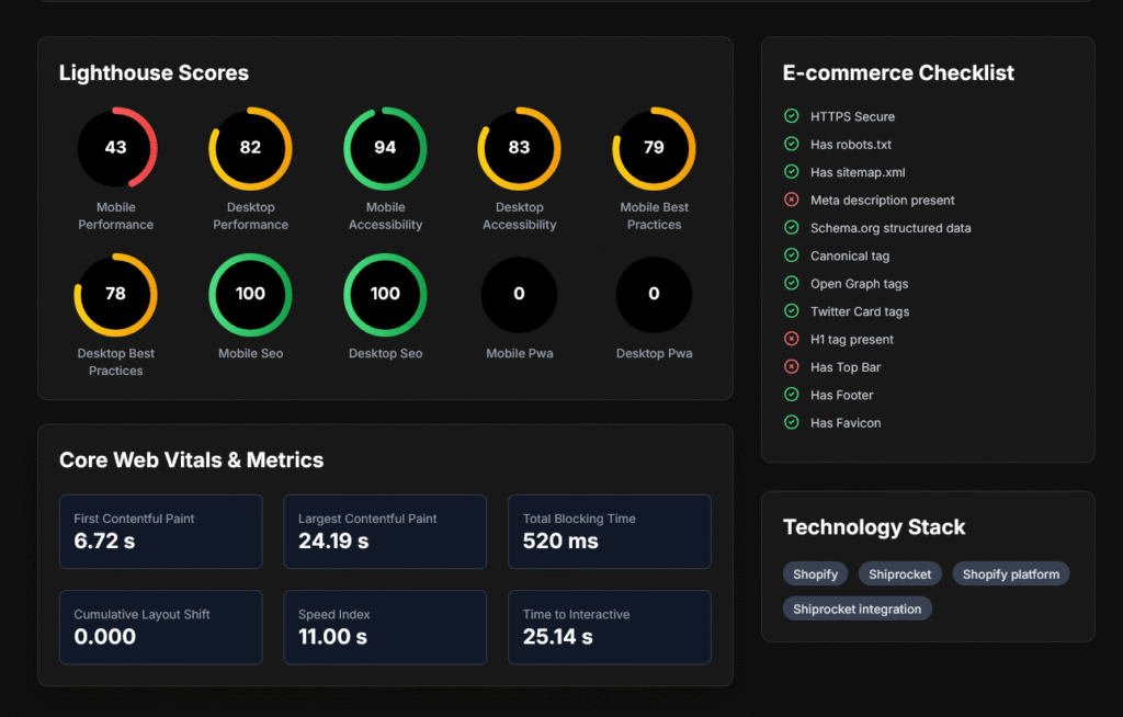 Our AI-powered audit dissects your entire tech stack from site speed to checkout friction, and delivers a free, personalized report in minutes on your email.